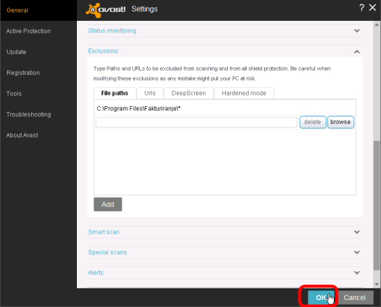 Međutim, kako dotični antivirusni program koristi veliki broj korisnika programa inFarkturiranje, ovdje možete pogledati kako konfigurirati antivirusni program da se omogući daljnji rad programa inFarkturiranje.