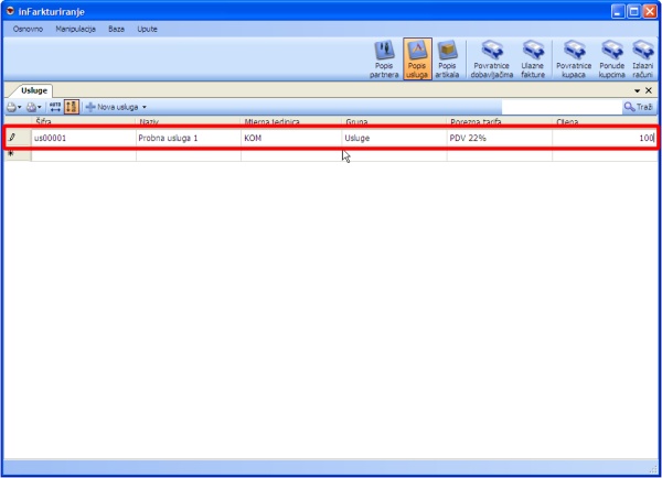 Novu uslugu možete unijeti na popisu usluga i na prozorima za unos nove ponude, fakture itd...